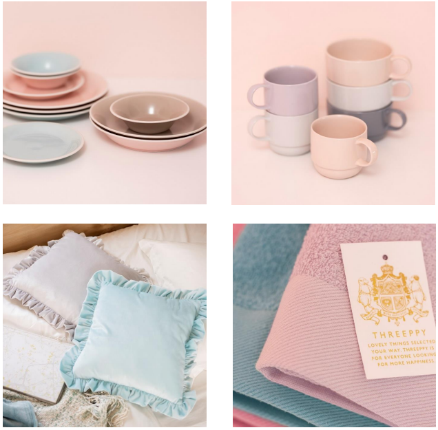 THREEPPY イオン長浦店は、「あいらしい。そして私らしい。」をコンセプトに、大人可愛い雑貨を追求するブランドとして、トレンドのグレーやピンク、ミントなどのくすみカラーを取り入れ、良質で心地よいデザインのアクセサリー、インテリア、食器、ファッション雑貨などを取り扱う。