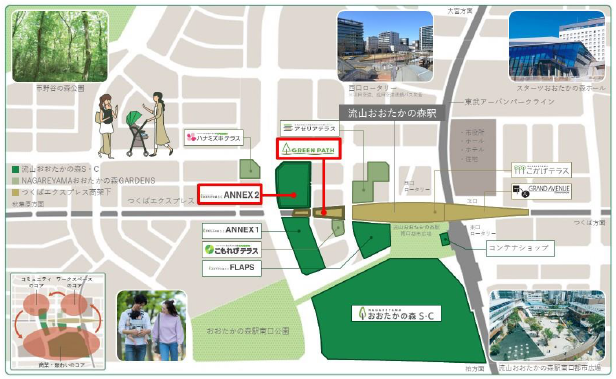 昨年オープンした「流山おおたかの森S・C FLAPS」、「NAGAREYAMA おおたかの森 GARDENS アゼリアテラス」に加え、「流山おおたかの森S・C ANNEX2」「GREEN PATH」が開業することで、東神開発が手掛ける「流山おおたかの森駅」周辺エリアの4カ年におよぶ「森のタウンセンターとしての商業機能集積事業」は完成する。この事業で創造した商業機能を核に、今後もまちづくり戦略に基づく面開発の拡大を図る。