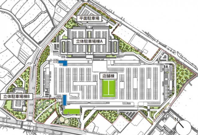 延床面積/約14万3600m2(約4万3400坪)店舗棟 約9万0200m2(約2万2786坪)、立体駐車場棟 約5万3400m2(約1万6154坪)