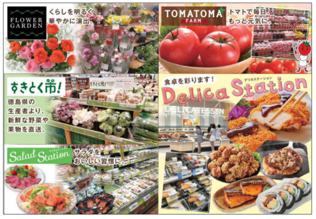 季節の花を取り揃える「フラワーガーデン」、産地を厳選したトマトを豊富に取り揃える「TOMATOMA FARM」、自分流にアレンジができるサラダを提案する「サラダステーション」、徳島県産の野菜や果物を揃える「すきとく市」などだ。