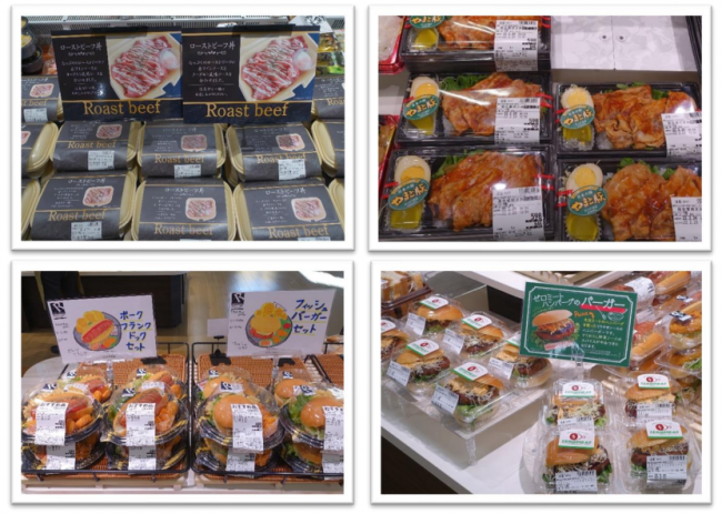 「惣菜コーナー」では、ローストビーフ丼ややまと豚を使った生姜焼き弁当、ローゼンセレクションのバーガー類が入ったセットプレート、大豆ミート使用のハンバーガー等、ランチタイムの顧客のニーズにあわせて豊富な商品をラインナップする。