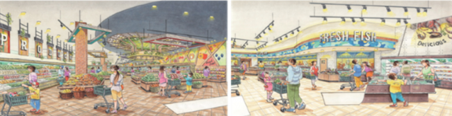 「買物体験型スーパーマーケット」とは①滞在時間を楽しむスーパーマーケット ②お客さまの五感を刺激するスーパーマーケット ③お客さま好みのスーパーマーケット ④買物以外の目的をもてるスーパーマーケット の4つを提供することを目指す。マックスバリュ関東にとって新フォーマットという位置づけだ。
