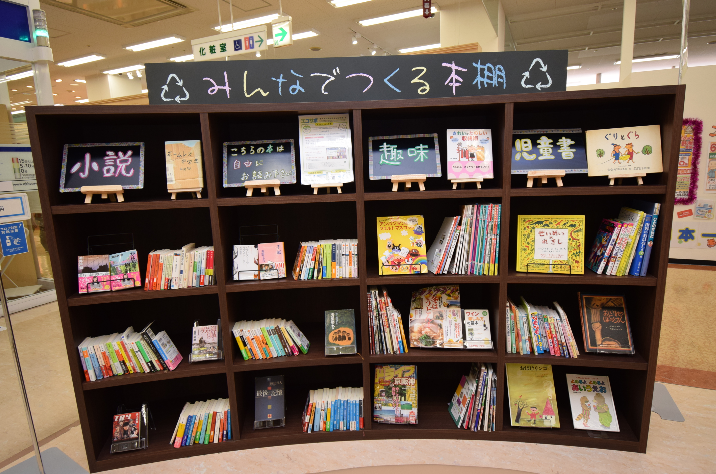 野洲店は平和堂全店の中で食品トレーなどの回収率が最も高く、ごみに対する意識が非常に高いエリアだという。そこで家庭で不要になったものの一部を店頭で回収する「買替お引取り」や、住民が持ちこむ本でつくる「みんなでつくる本棚」など、ごみを捨てない・増やさない、サステナブルな暮らしをサポートするという取り組みを始める。