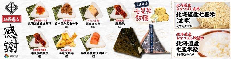 「安田精米」では精米したての「北海道産ななつぼし」と玄米を販売する。さらにこれらの米を使って、注文を受けてから握るおにぎりを7種類取り揃える。おにぎりは、米の鮮度だけでなく、炊き方や握り方にもこだわって独自に研究を重ねた。米のほかに、塩や海苔、水、具材も厳選したものを使用し、「安田精米」でしか食べられない特別メニューを提供する。