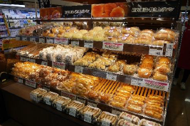 店内で焼き上げるインストアベーカリーを導入する。歯ごたえのあるリンゴを3つ切りにして包んだパイ「まるまるリンゴパイ」やサクッと焼き上げたデニッシュ生地にシロップをぬった「ツインクル」など、約40種類のパンを提供する。