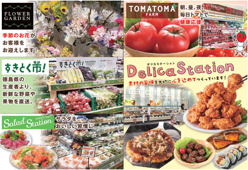 改装では「フラワーガーデン」、厳選したトマトを揃える「TOMATOMA FARM」、徳島県の野菜や果物を品揃えする「すきとく市」、自分流にアレンジができるサラダの提案コーナー「サラダステーション」、「デリカステーション」など、関西スーパーの最新マーチャンダイジングを導入する。