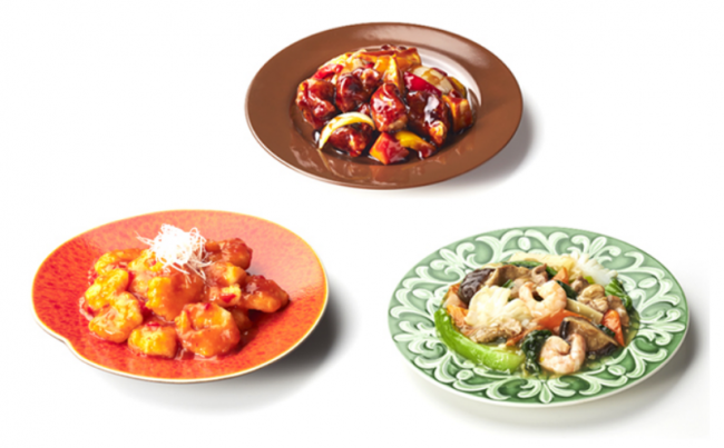 「チャイナチューボー」人気中華三種セット(イベリコ豚の酢豚 170g、エビチリソース 150g、野菜たっぷり八宝菜 150g)が1480円(税込み)。