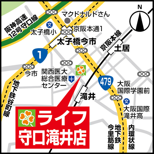 守口市内への出店は同店で2店舗目。京阪本線「滝井駅」の北側に位置し、道路を挟んで関西医科大学総合医療センターに隣接している。