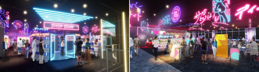 3階では、バンダイナムコがアミューズメント、フード、イベントなどを組み合わせた新業態「アミューズメントコンプレックス」を展開する。POPなネオンに囲まれた空間にアミューズメントエリアや飲食エリア、イベントエリアを設け、バンダイナムコグループが取り扱うIPコンテンツを楽しみ尽くすことができる場を提供する。