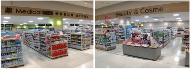 1階では薬品とコスメを一箇所に集約したヘルス&ビューティコーナーを展開する。コロナ禍で需要が高まっている健康食品やオーラル関連商材を拡大し、若い女性に人気のコスメも揃えた。