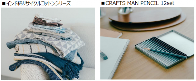 廃棄予定の端切れや落ち綿を再利用して作ったオリジナルの布商品「インド綿リサイクルコットン」シリーズや、創業70年以上の老舗鉛筆メーカー「北星鉛筆」の職人によってつくられた「CRAFTS MAN PENCIL 12set」といった生活に取り入れやすいベーシックで洗練されたデザインの日用品など約2000品を品揃えする。今後も毎月約100品を展開予定だ。
