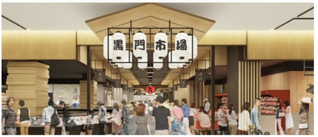 1階にはフロアの約半分約9600㎡(2904坪)を占める食の一大ゾーンを設ける。スーパーマーケット の「(仮称)ライフ セントラルスクエア」をはじめ、大阪市中央区日本橋にある「黒門市場」の店舗が出店する市場、食物販、レストラン、ファストフード、カフェを集積する。また3階にはフードコートを設ける。商業施設には食が欠かせない機能になってきた。