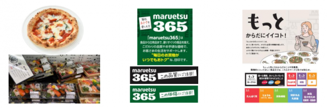 鮮度や味にこだわった「鮮魚鮨」や、高温で焼き上げた「窯焼ピッツァ」を販売する。焼きたてのパンは 、パーカーサンドや調理パンの品揃えを強化し、オフィスワーカー需要に対応する。さらに自信を持って選び抜いた商品を、「maruetsu365」として食品から日用品まで各売場で展開する。こだわりの品質の商品は「黒」お手頃な価格の商品は「緑」のPOPを目印として分かりやすく展開する。おいしく食べながら、からだに必要な栄養素を摂ったり余分にとりがちなモノを減らすことを提案するため、「もっとからだにイイコト!」をアイコンに売場を展開する。また 、食物アレルギー対応商品もPOPで案内する。