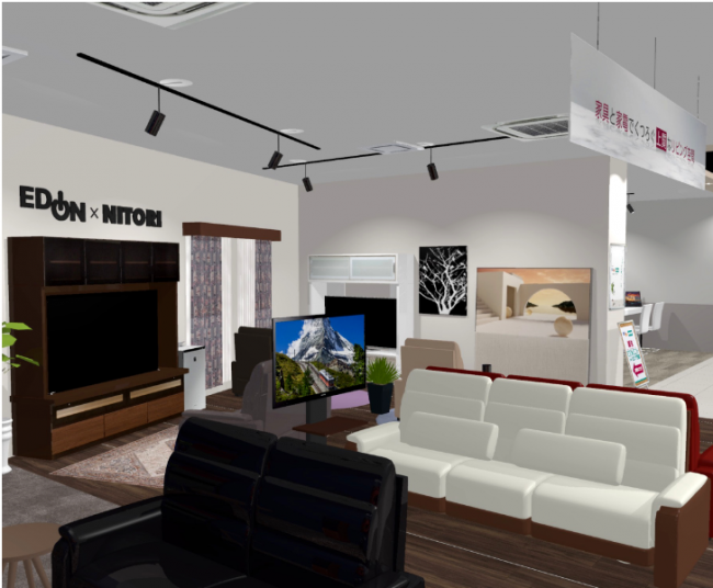 「エディオン×ニトリ」コラボブースは「家電と家具でくつろぐ上質なリビング空間」をテーマとして、家電と親和性の高い、家具・インテリア商品をトータルで体験・体感できる売場をつくる。
