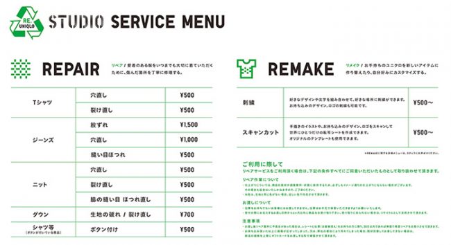 対象商品は、リペアがTシャツ、ジーンズ、ハイゲージニット、ダウン商品、シャツなどボタンのついた商品。リメイクが服、当日ユニクロで購入した服(コラボレーション、ライセンス商品は対象外)リペア・リメイク・カスタマイズサービスサービスは1カ所500円からとなる。