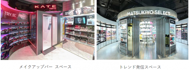 2階には、美と健康を中心にした体験サービス「KATE-TOKYO TWO FACES」を設置。AIが顧客の顔や服装を分析し、東京でトレンドとなっているメイクアップ2種を提案する。また、メイクアップバー、スキンケアコーナー(デジタル肌チェック)、サプリメントバーも配置していて、マツキヨキヨシの美と健康へのこだわりを世代、性別問わず、身近に楽しんでもらえる空間を提供していく。
