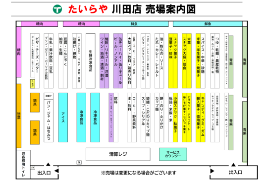売場レイアウトは反時計回りに壁面に沿って、青果、鮮魚、精肉、惣菜がセンター売場を囲む基本的な売場レイアウト。