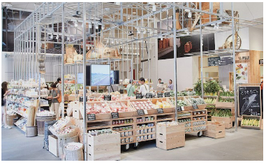 店舗2階フロアの中央には、板橋区の商店街のような賑わいや活気のある売場を設けた。東京都産を中心とした旬の野菜や果物、切花、無印良品の食品やキッチン用品など、生活の基本となる商品や地域の顔が見える商品を揃えた。
