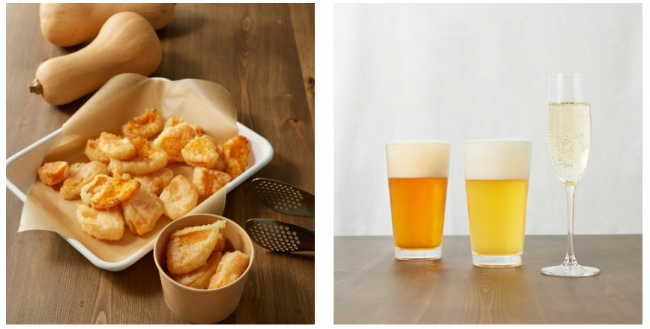 「東京バタ天」は100gで250円(税込み、以下同)。仕出し・弁当販売を行う「アホウドリ」監修のメニューだ。高知県のソウルフード「芋天」から着想を得て、東京都で生産されたバターナッツカボチャを使用した。塩味のあるサクサクの衣をまとわせたバターナッツの甘みと生地の塩味が特長だ。また、東京都内2つの醸造所のクラフトビールと、御徒町のワイナリーで醸造したスパークリングワインを販売する。「板橋22エール」「板橋22IPA」はSサイズ600円、Lサイズ1000円。「板橋22スパークリング」は680円。