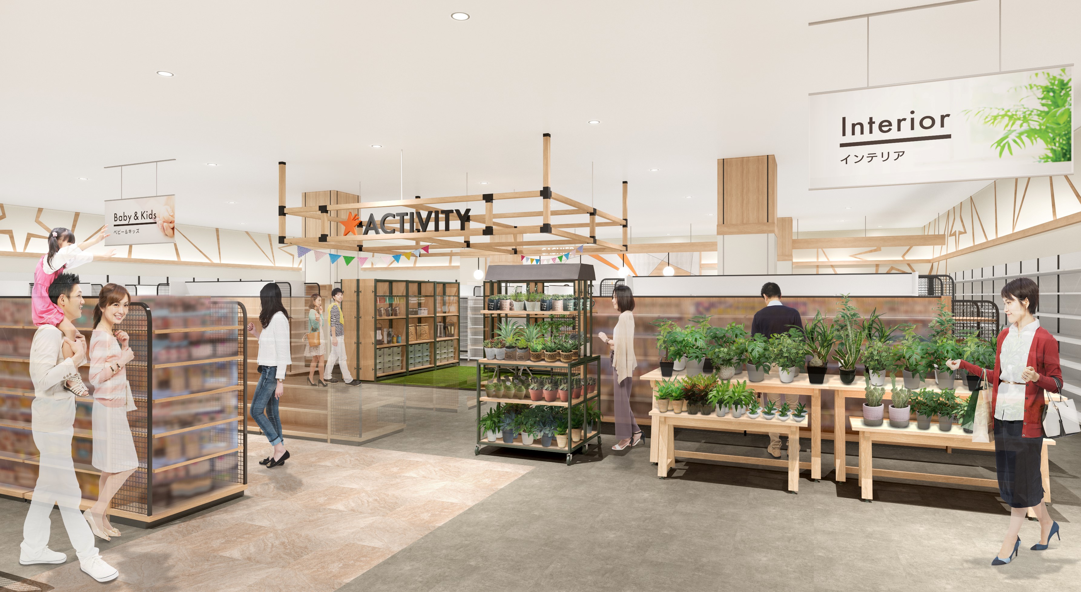 店舗中央の「ACTIVITY」コーナーでは季節ごとに、実際の商品使用シーンを想起させるようにディスプレイする。店頭ではシーズンコーナーや、ディズニーコーナーやスタッフおすすめのランキングコーナーなどを設けて提案力を強化する。顧客視点で、探しやすい商品陳列に徹する。また、ワークショップといった実際に体験して楽しむことができるイベントも計画する。