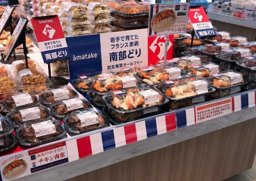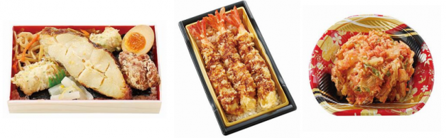惣菜売場では、南部どり食材を使った惣菜、握らずに挟むだけの新感覚「サンドおにぎり」、シェアして食べる「メガ盛り」弁当、特大海老天重など東武ストア渾身のワンランク上の「金」シリーズ、栄養バランスに配慮した「健康弁当」などバラエティ豊富に展開する。