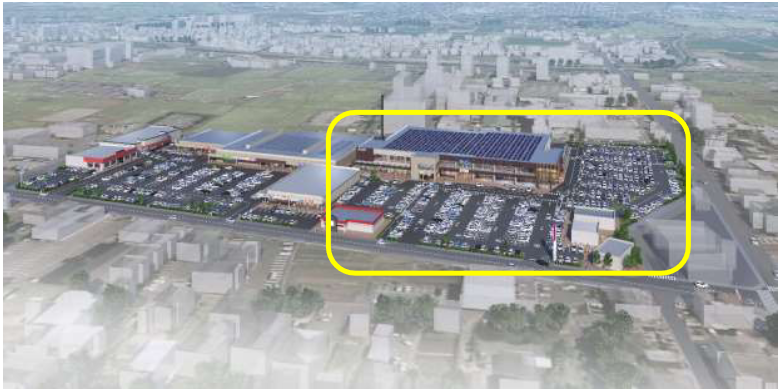 平屋建ての既存棟に2階建ての増床棟を加えると敷地面積、延べ床面積、総賃貸面積ともに約2倍となり、駐車台数も2倍以上の889台が整備される。