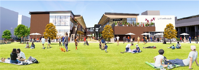スーパーマーケット、飲食店舗、クリニックモール、ウェルネス関連など生活利便性の高い約40店舗が入居する。屋外各所には、コンセプトをもたせた溜まり場や多様な植栽を整備するなど、滞在価値向上のための施策を講じる。約5000㎡の屋外広場を設け、地域連携を図ったイベントを実施できるスペースとする。