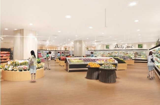 1つ目は、老朽設備の刷新による売場改善。農産売場から水産、畜産、惣菜売場へ続く導線を改善し、買い回りの良い開放感ある売場配置に変更する。冷蔵・冷凍ケースや冷蔵・冷凍の平台ケースを新設し、売場面積の拡大することによって品揃えを拡大させる。とくに消費者ニーズの高い冷凍商品売場は改装前の2倍に拡大する。また、レジゾーンを移設し、イートインコーナーも新設する。
