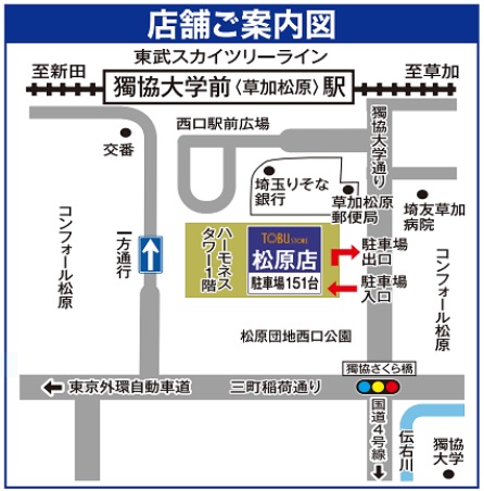 同店は1963年1月に開店した同社で最も歴史ある店舗で、東武スカイツリーライン「獨協大学前<草加松原>」駅の西口駅前に位置する。