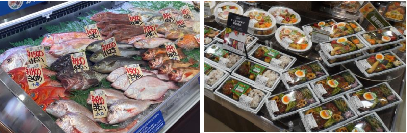 鮮魚売場では、旬魚の刺身を提供し、産地直送の近海魚の対面販売を行う。また寿司や海鮮丼といった魚河岸の寿司コーナーを設ける。