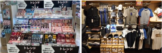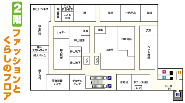 2階の日用品・衣料品売場では、コスメやペットフードなどの生活関連商品、有名衣料品ブランドの商品などを取り扱う。