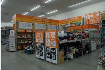 資材館では、プロが倉庫代わりに利用できるるように、資材・建材や工具・金物などの専門的な商品を豊富に品揃えする。また、各種工具などのレンタルや修理、木材のカットや取り置きサービスなど、現場で働くプロを強力にサポートする。
