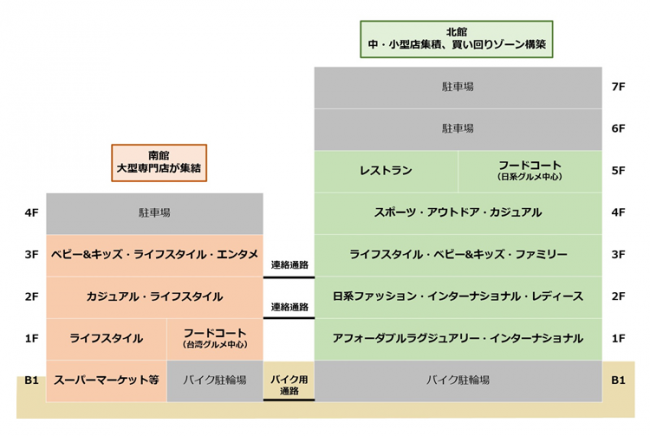 施設は大型専門店が入店する南館、中・小型店を集結させた北館の2棟で構成される。合わせて約300店舗のテナント規模となる。