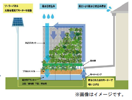 さらに、雨水を給水タンクに貯め、ソーラーパネル電源を利用した自動潅水システムも一部導入・再生可能エネルギーの活用として太陽光発電設備を屋上に導入、年間約3万kWh(脱炭素率約3.1%相当)のクリーンな電力を生み出す。(2023年2月稼働予定)