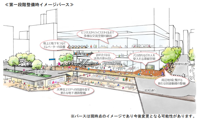 このプロジェクトではかつて城下町を通過する唐津街道(現・昭和通り)として、人の往来が多く宿場や商店等が軒を連ね、賑わいのある通りに面した場所であった歴史性を踏まえ 、新しい天神北の核として、この地域に勤める人、暮らす人、訪れる人が交流できる拠点づくりを目指す。あわせて、地下ネットワーク上の課題であったバリアフリー動線の確保を、地下街から続く地下通路の整備やエレベーターの設置などで実現する。郵便局通りの快適な歩行者ネットワークの実現などを通じ、天神中心部、須崎公園等の周辺地域、さらには、ウォーターフロントにつながる、都心部回遊拠点の形成を目指す。
