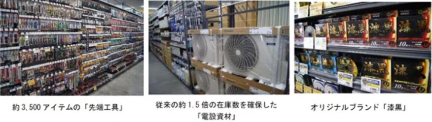 たとえば、電動工具に取り付ける「先端工具」を約3500アイテム、ねじなどの「締結部材」を約1500アイテムを販売する。またエアコンの配線器具などの「電設資材」は従来の約1.5倍の在庫数を確保する。機能性と耐久性を両立させた、同社オリジナルの工具ブランド「漆黒」の商品も多数取り扱う。