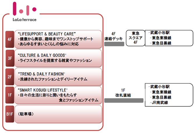 「ららテラス 武蔵小杉」は4階建てで、店舗面積は8000㎡(2420坪)。食やファッション、カルチャー、住生活などコンセプトごとに分かれた4フロアに、専門店72店舗が入居する。1階は東急東横線・目黒線とJR南武線の駅改札に直結しており(東急東横線・目黒線は4階も)、高い利便性を特徴とする。