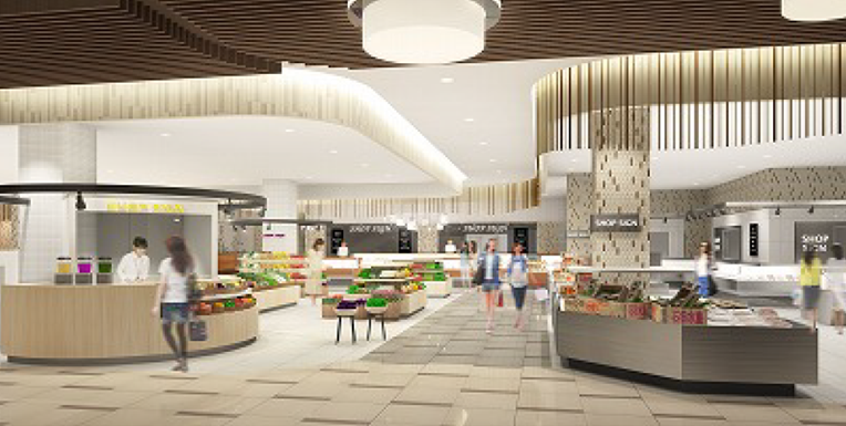 1階は”SMART KOSUGI LIFESTYLE”がコンセプト。駅直結の利便性を活かした「小杉マルシェ」と呼ばれる食品売場と、ライフスタイル提案型の物販店舗が入る。食品売場は「成城石井」をはじめ、生鮮3品の「魚力」(鮮魚)、「九州屋」(青果)、「大和」(精肉)、惣菜では「中国大陸料理 過門香」「たごさく」「四季の味 献心亭 匠」などの専門店をそろえる。また、物販はナチュラルコスメティック・ブランドの「ロクシタン」やジュエリー専門店「テイクアップ」の新業態が出店する。