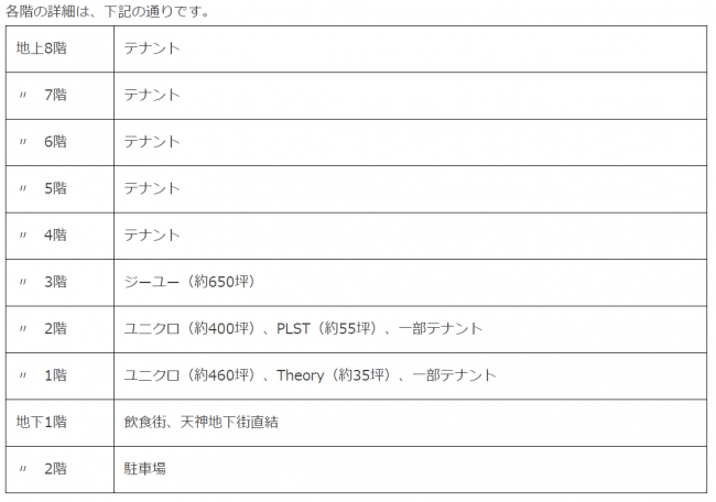 1階から3階をグループの店舗が出店する。これまで旧「ミーナ天神」で営業してきたユニクロに加え、ファーストリテイリンググループのブランドであるジーユー、プラステ、セオリーも新たに出店する。中でもユニクロは九州最大、ジーユーも九州最大規模の大型店となる。