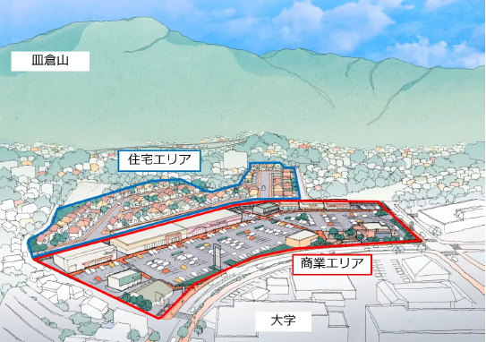 日本新三大夜景として知られる皿倉山の麓に位置するロケーションから、商業エリアは「(仮称)皿倉テラス」と称する。「日々の生活の中で ”楽しさ” ”美味しさ” ”くつろぎ” に出逢える場所」をコンセプトに、皿倉山の景観をバックにした開放的でくつろげる空間づくりを目指す。随所に緑を配置するほか、一部の屋外照明に太陽光発電設備を活用するなど環境にも配慮する。テナントについては飲食店のほか、ファッション関連の誘致を予定している。