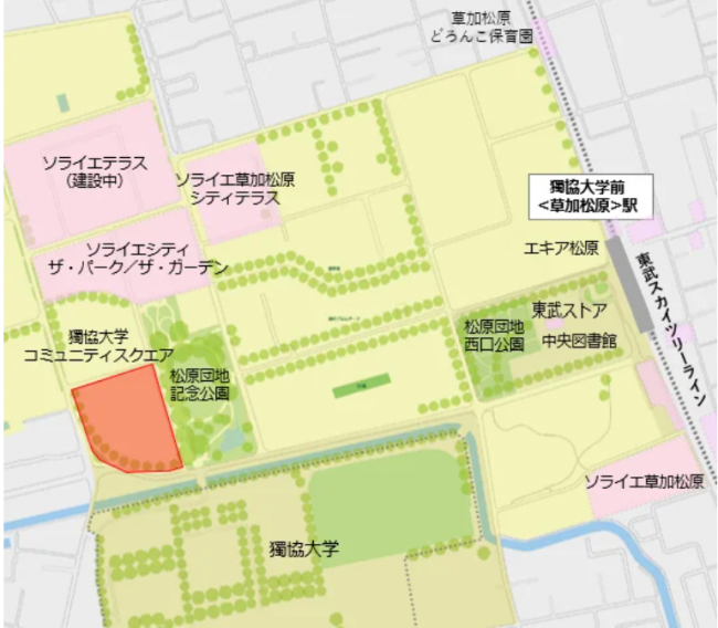 同施設は東武スカイツリーライン獨協大学前(草加松原)駅前の公園などの敷地内に立地。“カラダとココロの五感を満たすみんなに「心地よい暮らし」”の提案をコンセプトとしていて、獨協大学をはじめとした教育・文化施設や松原団地記念公園などが位置するこのエリアの特徴を活かした店舗構成となっている。