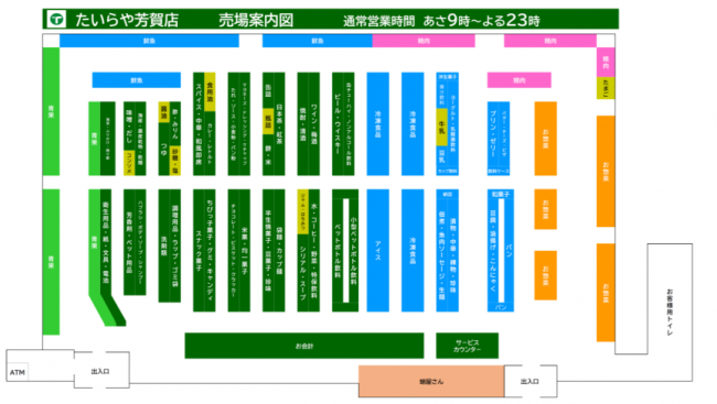 売場レイアウトは時計回りに壁面に沿って、青果、鮮魚、精肉、惣菜がセンター売場を囲む基本的な売場レイアウト。