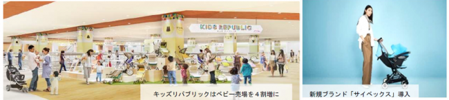 キッズ ベビー売場は4割増に拡大する。外出自粛が緩和され、ベビーカーの利用機会が増加傾向にあることから、ベビーカー、チャイルドシートなどの大型雑貨の品揃えを拡大する。安全性・デザイン性・機能性で高い評価のドイツの育児用品ブランド「Cybex(サイベックス)」のベビーカーなど国内外のブランドを幅広く提案する。売場を広くとることで、実際に見て、触って体験できる売場にする。