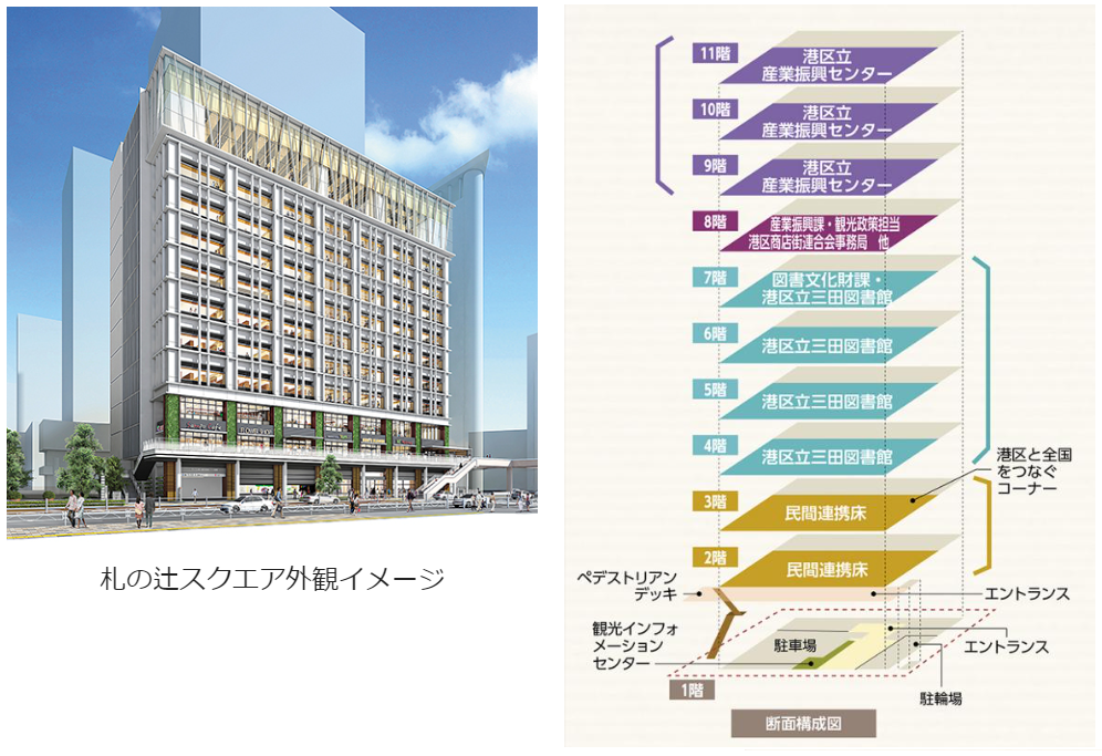 札ノ辻スクエアには、9階から11階が港区立産業振興センター、4階から7階が港区立三田図書館、2・3階が商業フロアとなる。