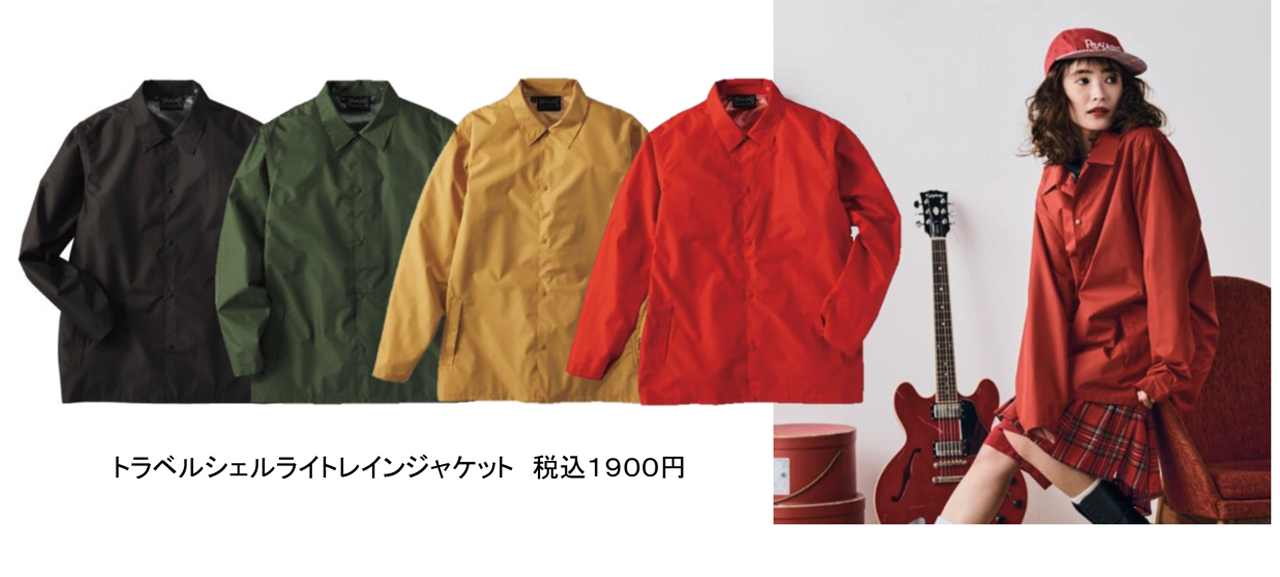 二つ目は、「トラベルシェルライトレインジャケット」。春先の外出時に羽織れるうえ、サコッシュ付き持ち運びできるレインジャケット。1900円。