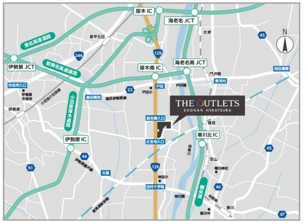 立地は神奈川県を南北に結ぶ主要幹線である国道129号に接道し、首都圏中央連絡自動車道(圏央道)や東名高速道路、新東名高速道路のインターチェンジからのアクセスに優れた、広域からの集客が見込める交通の要衝。