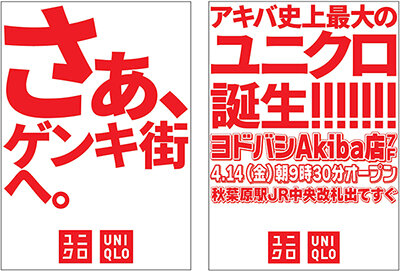 ユニクロ ヨドバシAkiba店のキャッチコピーは、「さぁ、ゲンキ街へ。」。秋葉原駅から徒歩0分の立地の店舗でLifeWearを提供し、秋葉原の街で働く人、遊ぶ人、 暮らす人すべてを「ゲンキ」にしよう、というコンセプトだ。電器街の「デンキ」と「ゲンキ」をかけてもいるのだろう。