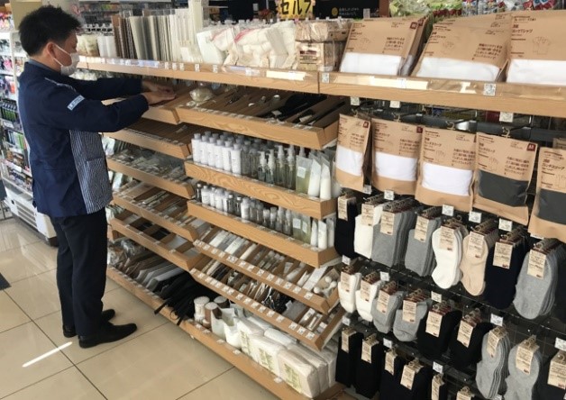 東北6県と中部5県のローソン店舗では化粧水、文具、衣類、レトルトカレー、菓子など生活の基本となる商品約200アイテムを、専用の販促物を使用した複数にわたる棚で展開する。