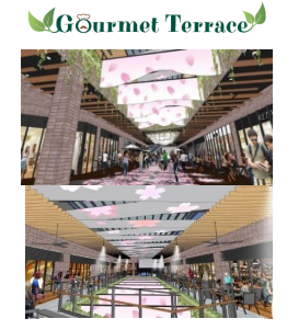 GF・1Fに開放的なテラス席を擁するアウトモール「GOURMET TERRACE」では、夜間に吹き抜け部分にデジタルプロジェクションを施し、幾何学模様のデザインを音楽に合わせた動きのある映像で届けるなど、新しいエンターテインメントを視覚・聴覚で楽しみながら食事ができる。また、より涼しい環境で食事ができるように、エリア内の断熱装置(シェード)や、送風機能(ミストスプレー・ファン)を設置、快適性を向上する。