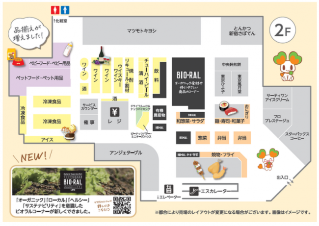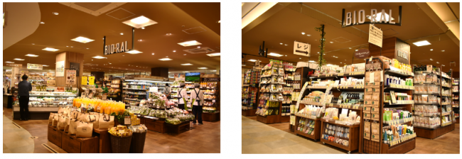 大型となったビオラルコーナーでは、「BIO-RAL」商品や、「オーガニック・ローカル・ヘルシー・サステナビリティ」のコンセプトに沿った商品など幅広く取り揃える。加工食品以外にも、生産者の顔が見える有機野菜・果物も品揃えする。